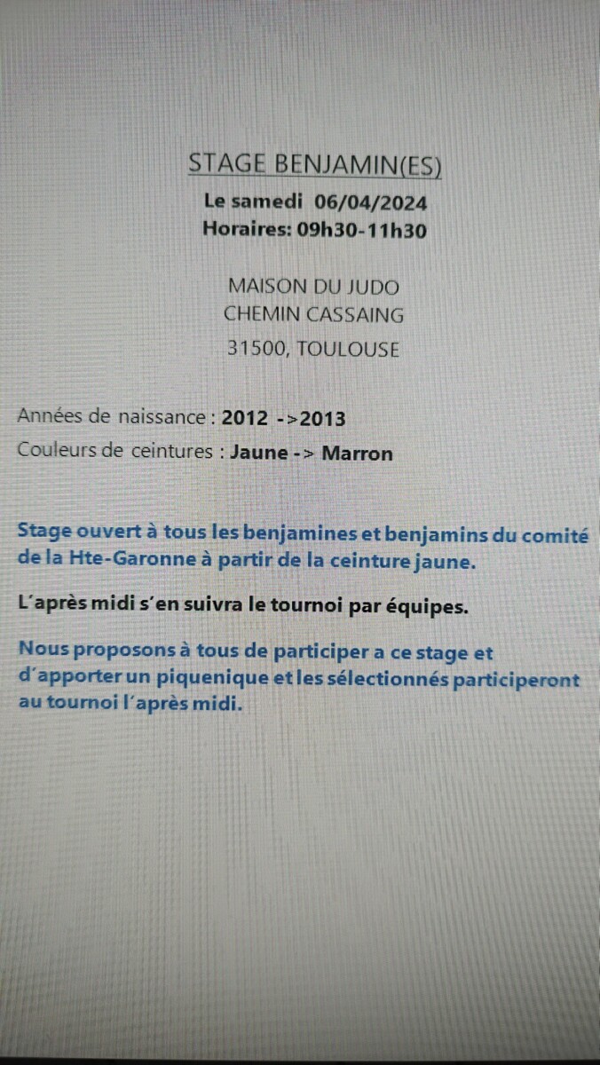 Stage benjamin ouvert à tous les benjamins ceinture jaune minimum